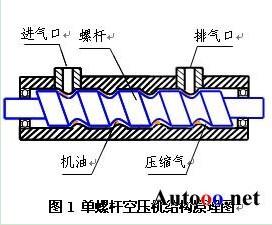 以單螺桿空壓機為例說(shuō)明空氣壓縮機工作原理,如圖1所示為單螺桿空氣壓縮機的結構原理圖。螺桿式空氣壓縮機的工作過(guò)程分為吸氣、密封及輸送、壓縮、排氣四個(gè)過(guò)程。當螺桿在殼體內轉動(dòng)時(shí),螺桿與殼體的齒溝相互嚙合,空氣由進(jìn)氣口吸入,同時(shí)也吸入機油,由于齒溝嚙合面轉動(dòng)將吸入的油氣密封并向排氣口輸送;在輸送過(guò)程中齒溝嚙合間隙逐漸變小,油氣受到壓縮;當齒溝嚙合面旋轉至殼體排氣口時(shí),較高壓力的油氣混合氣體排出機體。