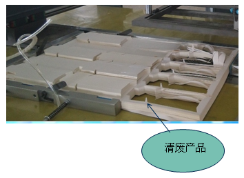 1.采取機械頂針排廢方式。模架下壓固定住材料,然后通過(guò)油缸將頂針頂出,沖出成品,功率較大,對材料較厚的產(chǎn)品有很好的清廢效果。